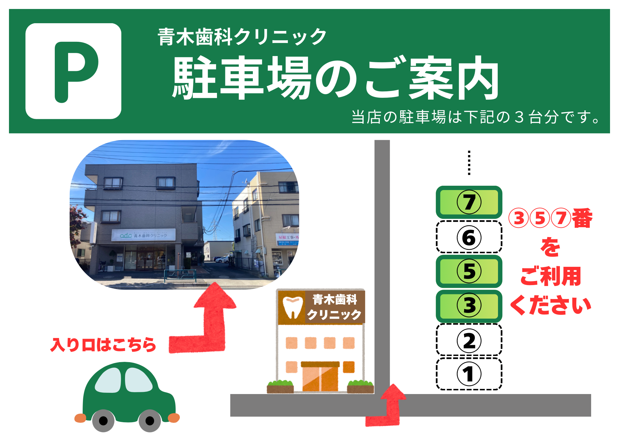 お車の方は、医院横駐車場の5番もしくは医院前の空きスペースに駐車してください。止める場所がわからない場合は、スタッフにお聞きください。